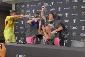 迈阿密国际主帅马斯切拉诺出席赛后发布会,遭到迈阿密国际球员的“突袭”,球员们闯入发布会现场,向他泼洒啤酒庆祝。