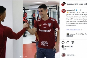 圣保罗社媒晒出奥斯卡的照片,这位正在休养中的巴西中场来到俱乐部训练中心,与队友、教练团队重聚。