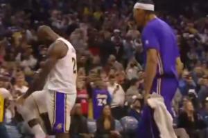 你干嘛!詹姆斯豪迈庆祝再踩霸王步 没踩完被海斯推一把中断了!