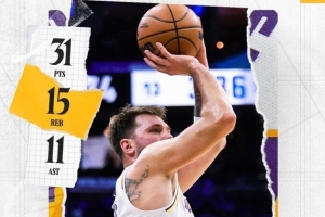 31+15+11!湖人官推发布东契奇数据海报:又一场三双表现