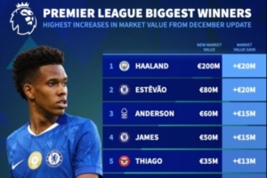 德转英超身价涨幅榜:哈兰德、埃斯特旺+2000万欧最多