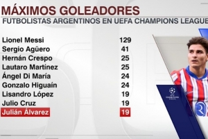 阿根廷球员欧冠射手榜:梅西129球居首,阿尔瓦雷斯19球并列第七