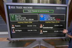 据此,ESPN薪资专家Bobby Marks进行模拟交易,字母哥和库兹马去尼克斯,雄鹿得到唐斯和米卡尔·布里奇斯。