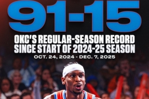 无敌!上赛季至今雷霆常规赛总战绩:91胜15负&胜率86%