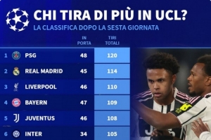 体育资讯12月11日讯 德国转会市场统计了本赛季欧冠各队的射门次数,并列出榜单,巴黎120次射门居首,皇马、利物浦二三位。