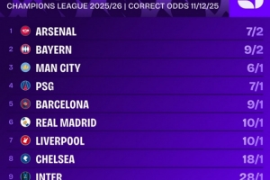 欧冠夺冠赔率排名:阿森纳居首,拜仁、曼城、巴黎、巴萨前五