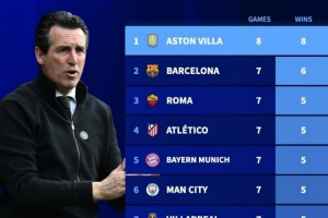 五大联赛球队自11月以来胜场榜:维拉8连胜居首,巴萨7场6胜次席